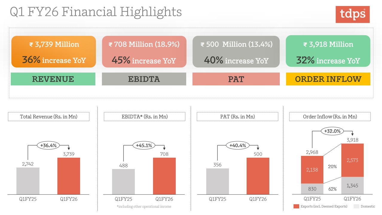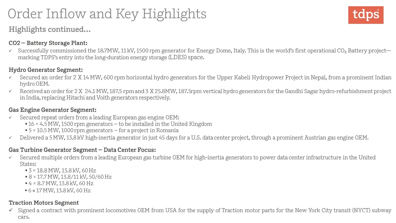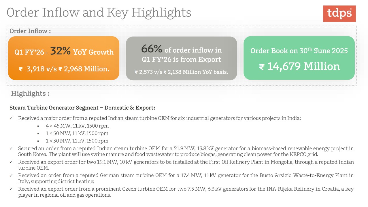 TD Power delivered strong growth in Q1 with robust export order inflow and margin expansion. US tariff issue is being proactively addressed via Turkey operations, limiting revenue risk. Segment diversification (steam, gas, hydro, motors, railways) plus strong global demand drivers (especially data centers & AI) position the company for multi-year growth, with FY26 guidance likely to be upgraded.